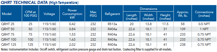 Los secadores refrigerativos de alta temperatura (Quincy QRHT) son ideales para compresores que su caudal de aire comprimido está a una mayor temperatura, como son algunos compresores de pistón que no tienen post enfriador. Esta serie de secadores integran 5 elementos: Post enfriador, Secador refrigerantes, separador de humedad, Drenaje con 0% de pérdida y un filtro coalescente.